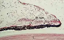 The back surface is covered by a heavily pigmented epithelial layer that is two cells thick (the iris pigment epithelium), but the front surface has no epithelium. This anterior surface projects as the dilator muscles. The high pigment content blocks light from passing through the iris to the retina, restricting it to the pupil.[3] The outer edge of the iris, known as the root, is attached to the sclera and the anterior ciliary body. The iris and ciliary body together are known as the anterior uvea. Just in front of the root of the iris is the region referred to as the trabecular meshwork, through which the aqueous humour constantly drains out of the eye, with the result that diseases of the iris often have important effects on intraocular pressure and indirectly on vision. The iris along with the anterior ciliary body provide a secondary pathway for aqueous humour to drain from the eye.