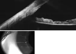 The collarette is the thickest region of the iris, separating the pupillary portion from the ciliary portion. The collarette is a vestige of the coating of the embryonic pupil.[3] It is typically defined as the region where the sphincter muscle and dilator muscle overlap. Radial ridges extend from the periphery to the pupillary zone, to supply the iris with blood vessels. The root of the iris is the thinnest and most peripheral.[4]