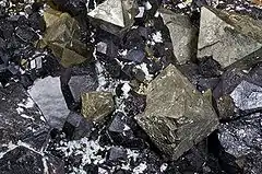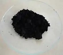 Iron(II,III) oxide, or black iron oxide, is the chemical compound with formula Fe3O4. It occurs in nature as the mineral magnetite. It is one of a number of iron oxides, the others being iron(II) oxide (FeO), which is rare, and iron(III) oxide (Fe2O3) which also occurs naturally as the mineral hematite. It contains both Fe2+ and Fe3+ ions and is sometimes formulated as FeO ∙ Fe2O3. This iron oxide is encountered in the laboratory as a black powder. It exhibits permanent magnetism and is ferrimagnetic, but is sometimes incorrectly described as ferromagnetic.[4] Its most extensive use is as a black pigment (see: Mars Black). For this purpose, it is synthesized rather than being extracted from the naturally occurring mineral as the particle size and shape can be varied by the method of production.[5]