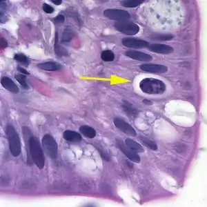 The coccidian parasite Cystoisospora belli infects the epithelial cells of the small intestine, and is the least common of the three intestinal coccidia that infect humans (Toxoplasma, Cryptosporidium, and Cystoisospora).