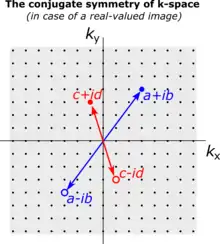A nice symmetry property exists in k-space if the image magnetization Mxy is prepared to be proportional simply to a contrast-weighted proton density and thus is a real quantity. In such a case, the signal at two opposite locations in k-space is: