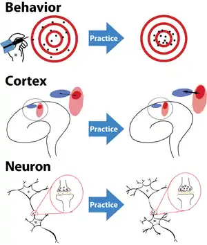 Adaptive plasticity along with practice in three levels. In behavior level, performance (e.g., successful rate, accuracy) improved after practice.[31][32] In cortical level, motor representation areas of the acting muscles enlarged; functional connectivity between primary motor cortex (M1) and supplementary motor area (SMA) is strengthened.[33][34][35][36][37][38][39] In neuronal level, the number of dendrites and neurotransmitter increase with practice.[34][40][41]