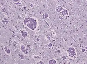 A histopathology slide of a brain with Krabbe disease showing giant cells with PAS stain inclusions ("globoid cells") within astrocytic gliosis and loss of myelinated fibers.
