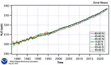 - ↑ Thompson RL, Lassaletta L, Patra PK, Wilson C, Wells KC, Gressent A, et al. (18 November 2019). "Acceleration of global N 2 O emissions seen from two decades of atmospheric inversion". Nature Climate Change. 9 (12): 993–998. Bibcode:2019NatCC...9..993T. doi:10.1038/s41558-019-0613-7. hdl:11250/2646484. ISSN 1758-6798. S2CID 208302708.