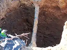 In modern times, lead was still widely used in water distribution systems and plumbing hardware before the early 20th century, including lead pipes, leaded solder and leaded alloys.[8] One part of the system is the connections between the water mains and the water user locations. A service line is a pipe that makes the connection, which was also made of lead in those days. The first portion of the service line is called a gooseneck, which connects to a valve at the water main and is required to be flexible to allow some movement. Lead goosenecks (also called lead service connections or LSCs) were commonly used in the past due to their durability and flexibility.[9][10] In colder-weather areas, the connection between the water main and the rest of the service line is subjected to expansion and contraction during temperature changes. When stiffer service lines made of galvanized steel pipe were used, lead goosenecks were installed to connect to the water main to reduce breakage from such expansion and contraction.[11]