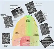 The cells of the lens epithelium also divide into new lens fibers at the lens equator.[9] The lens lays down fibers from when it first forms in embryo until death.[10]