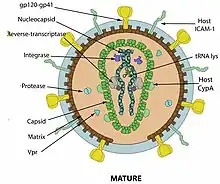 Lentivirus is a genus of retroviruses that cause chronic and deadly diseases characterized by long incubation periods, in humans and other mammalian species.[2] The genus includes the human immunodeficiency virus (HIV), which causes AIDS. Lentiviruses are distributed worldwide, and are known to be hosted in apes, cows, goats, horses, cats, and sheep as well as several other mammals.[2]