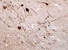 Lewy neurites are abnormal neurites in diseased neurons, containing granular material and abnormal α-synuclein filaments similar to those found in Lewy bodies.[19] Like Lewy bodies, Lewy neurites are a feature of α-synucleinopathies such as dementia with Lewy bodies, Parkinson's disease, and multiple system atrophy.[20] They are also found in the CA2-3 region of the hippocampus in Alzheimer's disease.[20]