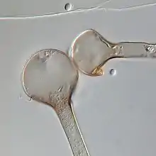 Lichtheimia corymbifera produces small, dark spores inside pear-shaped (pyriform) sporangia.[5] The species is characterized by a conically shaped columella and a short, pronounced projection, a funnel-shaped apophysis, on the top. The sporangiophores (sporangia-bearing stalks) are hyaline to slightly pigmented, sometimes branched, and arising from stolons in groups of three to seven. The zygospores are naked with equatorial rings, have opposed suspensors, and lack appendages. There is limited production of rhizoids, thus, it is often difficult to identify them without the assistance of a dissecting microscope.[4]