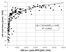 Plot of life expectancy vs. GDP per capita in 2009. This phenomenon is known as the Preston curve.