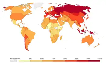 Prevalence of tobacco use (% of adults) worldwide[15]