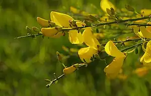 | Cytisus scoparius | broom, common broom | Contains toxic alkaloids that depress the heart and nervous system.[92] The alkaloid sparteine is a class 1a antiarrhythmic agent, a sodium channel blocker. It is not FDA-approved for human use as an antiarrhythmic agent and it is not included in the Vaughn Williams classification of antiarrhythmic drugs. | ![]() | |