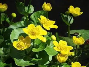 | Caltha palustris | marsh-marigold, kingcup | Ranunculaceae | It contains several active substances of which the most important from a toxicological point of view is protoanemonin. Ingesting large quantities of the plant may cause convulsions, burning of the throat, vomiting, bloody diarrhea, dizziness, and fainting. Contact of the skin or mucous membranes with the juices can cause blistering or inflammation, and gastric illness if ingested. Younger parts seem to contain lower toxin concentrations and heating breaks these substances down. Small amounts of Caltha in hay do not cause problems when fed to livestock, but larger quantities can lead to gastric illness.[67] | ![]() |
