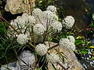 | Cicuta spp. | water hemlock, cowbane, wild carrot, snakeweed, poison parsnip, false parsley, children's bane, death-of-man | Apiaceae | The root, when freshly pulled out of the ground, is extremely poisonous and contains cicutoxin, a central nervous system stimulant that induces seizures. When dried, the poisonous effect is reduced. The most common species is C. maculata; one of the species found in the Western United States, C. douglasii, often found in pastures and swamps, has especially thick stems and very large and sturdy flowers which are sometimes harvested for flower displays. This is inadvisable as the sap is also toxic. | ![]() |