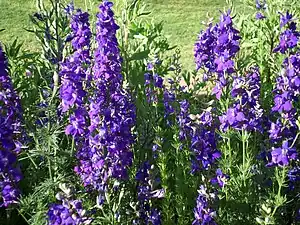 | Delphinium spp. | larkspur | Ranunculaceae | Contains the alkaloid delsoline. Young plants and seeds are poisonous, causing nausea, muscle twitches, paralysis, and often death. | ![]() |