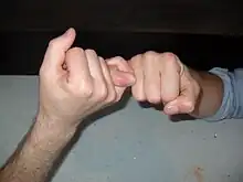 Among American children, a "pinky swear" or "pinky promise" is made when a person wraps one of their pinky fingers around another person's pinky and makes a promise.[6] Something similar is also seen in China and Korea, where people link their pinky fingers and then stamp their thumbs together to make a yaksok (promise).