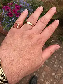 Signet ring (little finger) and wedding ring (ring finger) on a left hand