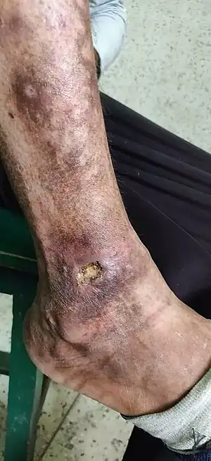 It is a longterm skin condition seen predominantly in young to middle-aged women.[2] One acronym used to describe its features is "painful purpuric ulcers with reticular pattern of the lower extremities" (PURPLE).[1][3]