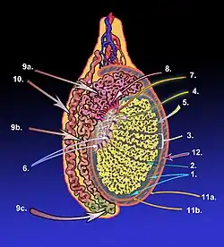 ![]() A diagram of the major components of an adult human testicle, including the following numbered items: 1. Tunica albuginea, 2. Septula testis, 3. Lobulus testis, 4. Mediastinum testis, 5. Tubuli seminiferi contorti, 6. Tubuli seminiferi recti, 7. Rete testis, 8. Ductuli efferentes testis, 9a. Head of epididymis, 9b. Body of epididymis, 9c. Tail of epididymis, 10. Vas deferens, 11a. Tunica vaginalis (parietal lamina), 11b. Tunica vaginalis (visceral lamina), and 12. Cavity of tunica vaginalis. | |