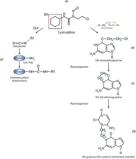 It is closely related to semustine and is in the same family as streptozotocin. It is a highly lipid-soluble drug,[6] thus it crosses the blood-brain barrier. Lomustine has a long time to nadir (the time when white blood cells reach their lowest number). It is a monofunctional alkylating agent, alkylates both DNA and RNA, has the ability to cross-link DNA.[7] As with other nitrosoureas, it may also inhibit several key enzymatic processes by carbamoylation of amino acids in proteins.[8] Lomustine is cell-cycle nonspecific.