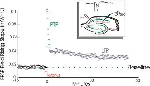 - 1 2 Bliss TV, Gardner-Medwin AR (July 1973). "Long-lasting potentiation of synaptic transmission in the dentate area of the unanaestetized rabbit following stimulation of the perforant path". The Journal of Physiology. 232 (2): 357–74. doi:10.1113/jphysiol.1973.sp010274. PMC 1350459. PMID 4727085.