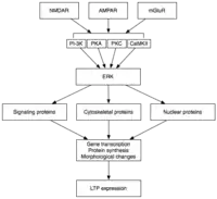 Late LTP is induced by changes in gene expression and protein synthesis brought about by the persistent activation of protein kinases activated during E-LTP, such as MAPK.[33][34][39] In fact, MAPK—specifically the extracellular signal-regulated kinase (ERK) subfamily of MAPKs—may be the molecular link between E-LTP and L-LTP, since many signaling cascades involved in E-LTP, including CaMKII and PKC, can converge on ERK.[39] Recent research has shown that the induction of L-LTP can depend on coincident molecular events, namely PKA activation and calcium influx, that converge on CRTC1 (TORC1), a potent transcriptional coactivator for cAMP response element binding protein (CREB).[40] This requirement for a molecular coincidence accounts perfectly for the associative nature of LTP, and, presumably, for that of learning.