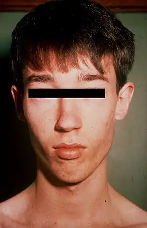 Craniofacial and other features of LFS include: maxillary hypoplasia (underdevelopment of the upper jaw bone),[9] a small mandible (lower jaw bone) and receding chin,[3][17] a high-arched palate (the roof of the mouth), with crowding and misalignment of the upper teeth;[5][7] macrocephaly (enlarged skull) with a prominent forehead,[3][9] hypernasal speech (voice),[5][7] a long nose with a high, narrow nasal bridge;[9] a deep, short philtrum (the indentation in the upper lip, beneath the nose),[9] low-set ears with some apparent retroversion,[9] hypotonia (decreased muscle tone),[3] pectus excavatum (a malformity of the chest),[9] slightly enlarged to normal testicular size in males,[9][17] and seizures.[9]