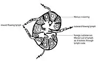 The lymph nodes, the spleen and Peyer's patches, together are known as secondary lymphoid organs. Lymph nodes are found between lymphatic ducts and blood vessels. Afferent lymphatic vessels bring lymph fluid from the peripheral tissues to the lymph nodes.[4] The lymph tissue in the lymph nodes consists of immune cells (95%), for example lymphocytes, and stromal cells (1% to 5%)[5] The genesis of lymph nodes begins within the blood and the lymphatic system.[4] Interactions between stromal and hematopoietic cells are important for the development of lymph nodes. Crosstalk LEC, lymphoid tissue inducer cells and mesenchymal stromal organizer cells initiate the formation of lymph nodes.[1]