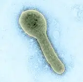 Like all filoviruses, marburgvirions are filamentous particles that may appear in the shape of a shepherd's crook or in the shape of a "U" or a "6", and they may be coiled, toroid, or branched.[18] Marburgvirions are generally 80 nm in width, but vary somewhat in length. In general, the median particle length of marburgviruses ranges from 795 to 828 nm (in contrast to ebolavirions, whose median particle length was measured to be 974–1,086 nm ), but particles as long as 14,000 nm have been detected in tissue culture.[19]