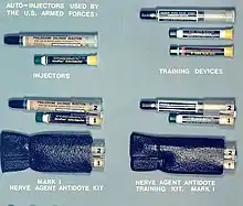 In the United States military, the Mark I NAAK, or MARK I Kit, ("Nerve Agent Antidote Kit") is a dual-chamber autoinjector: Two anti-nerve agent drugs—atropine sulfate and pralidoxime chloride—each in injectable form, constitute the kit. The kits are only effective against the nerve agents tabun (GA), sarin (GB), soman (GD) and VX.