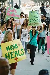 Medical cannabis advocates began to gain ground in the early 1990s with a series of legislative achievements in the state of California. Proposition P was approved by 79% of San Francisco voters in November 1991, calling on state lawmakers to pass legislation allowing the medical use of cannabis.[12] Additionally, the city board of supervisors passed a resolution in August 1992 urging the police commission and district attorney to "make lowest priority the arrest or prosecution of those involved in the possession or cultivation of [cannabis] for medicinal purposes" and to "allow a letter from a treating physician to be used as prima facia evidence that marijuana can alleviate the pain and suffering of that patient's medical condition".[62] The resolution enabled the open sale of cannabis to AIDS patients and others within the city, most notably through the San Francisco Cannabis Buyers Club which was operated by medical cannabis activist Dennis Peron (who spearheaded Proposition P and later the statewide Proposition 215).[63] Similar clubs appeared outside San Francisco in the ensuing years as other cities passed legislation to support the medical use of cannabis. The Wo/Men's Alliance for Medical Marijuana was founded in 1993 after 75% of Santa Cruz voters approved Measure A in November 1992.[64] And the Oakland Cannabis Buyers' Cooperative was founded in 1995 shortly before the city council passed multiple medical cannabis resolutions.[64]