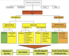 MGD can be classified based on gland secretion. MGD can be low delivery and high delivery. Low delivery is the most common form[3] and is classified in hyposecretory and obstructive. Hyposecretory implies low meibum secretion without terminal duct obstruction. This is associated with gland atrophy. Contact lens wear can lead to a decreased number of functional meibomian glands.[2] Obstructive MGD, where the terminal duct is obstructed, is the most common type of MGD. Obstructive MGD has been associated with age and acne treatment products with retinoids.[2] Obstructive MGD can be classified into noncicatricial and cicatricial. In noncicatricial, the terminal duct of meibomian glands are in their normal anatomic position. In cicatricial, they are dragged posteriorly into the mucosa.[2]