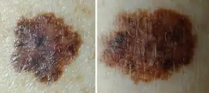 | Noncancerous dysplastic nevus (left) and cancerous melanoma (right) | |