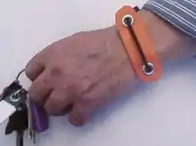 A memory clamp (also called a "reality clamp") is a generic name for a type of physical memory aid designed be worn on the wrist or finger to help the user remember something they might otherwise forget, and was originally invented by physicist Rick Yukon to create difficult-to-ignore visuals and a deliberately intrusive shape and size.[62][63] (For example, a child in a car seat, an important meeting, or the need to take one's own medicine.) A well designed memory clamp is designed to be difficult to ignore visually, typically with bright colors and sometimes contrasting base colors. A memory clamp is designed to cause a slight amount of visual discomfort and a slight amount of physical discomfort, so that the user maintains at least partial awareness of the intrusion, and is thus designed to be worn only intermittently, so the user doesn't become accustomed to it.[62]