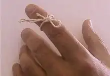 Physical memory aids, typically worn on the wrist or finger, can help the user remember something they might otherwise forget. Common aids such as this are used by people with memory loss. Typical memory aids for people with Alzheimer's includes sticky notes and color-coded memory aids.[57] Tying a string around one's finger to remember something important is both a literary device,[58] and an actual practice.[59] One school yearbook from 1849 suggests using either a string tied around a finger or a knot tied in the corner of a handkerchief to remember something important to the student.[60] The oldest documented legend of a string used as a memory aid was in the myth Ariadne's thread, where a thread was presented by Ariadne to her lover Theseus to find his way out of the minotaur's labyrinth. The knot-in-the-handkerchief memory aid was used by German philosopher Martin Heidegger.[61]