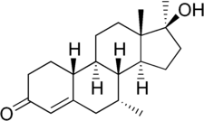 Mibolerone, also known as 7α,17α-dimethyl-19-nortestosterone (DMNT) or as 7α,17α-dimethylestr-4-en-17β-ol-3-one,[8] is a synthetic estrane steroid and a 17α-alkylated derivative of nandrolone (19-nortestosterone). It is the 17α-methyl derivative of trestolone (7α-methyl-19-nortestosterone; MENT).[8] Other related AAS include metribolone (17α-methyl-δ9,11-19-nortestosterone) and dimethyltrienolone (7α,17α-dimethyl-δ9,11-19-nortestosterone).
