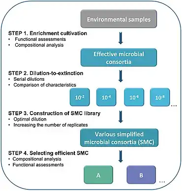 Two approaches exist to obtain microbial consortia involving either (i) a synthetic assembly from scratch by combining several isolated strains,[14] or (ii) obtainment of complex microbial communities from environmental samples.[15] For the later, enrichment process is often used to get the desired microbial consortia.[16][17][18] For instance, a termite gut-derived consortium showing a high xylanase activity was enriched on raw wheat straw as the sole carbon source, which was able to transform lignocellulose into carboxylates under anaerobic conditions.[19]