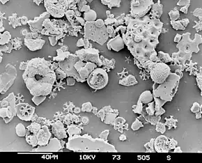Siliceous ooze is a type of biogenic pelagic sediment located on the deep ocean floor. Siliceous oozes are the least common of the deep sea sediments, and make up approximately 15% of the ocean floor.[40] Oozes are defined as sediments which contain at least 30% skeletal remains of pelagic microorganisms.[41] Siliceous oozes are largely composed of the silica based skeletons of microscopic marine organisms such as diatoms and radiolarians. Other components of siliceous oozes near continental margins may include terrestrially derived silica particles and sponge spicules. Siliceous oozes are composed of skeletons made from opal silica Si(O2), as opposed to calcareous oozes, which are made from skeletons of calcium carbonate organisms (i.e. coccolithophores). Silica (Si) is a bioessential element and is efficiently recycled in the marine environment through the silica cycle.[42] Distance from land masses, water depth and ocean fertility are all factors that affect the opal silica content in seawater and the presence of siliceous oozes.