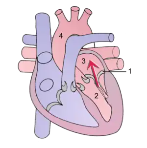 During contraction of the left ventricle there is backflow (arrow) into the left atrium. (1) Mitral valve (2) Left ventricle (3) Left atrium (4) Aorta