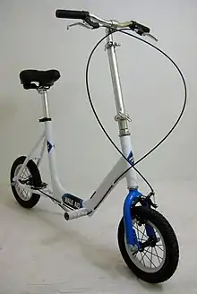 The Walk Aid Scooter allows a user with normal balance and foot, knee or hip conditions to unload the lower extremities. The two-wheeled scooter has a bicycle-type seat and handlebars, and is manually propelled with one or both feet like a balance bicycle. This walking aid scooter provides more support than a cane and is lighter, less bulky and easier to propel than a wheelchair.