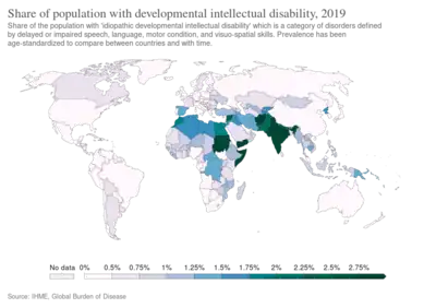 Intellectual disability affects about 2 to 3% of the general population.[8] Seventy-five to ninety percent of the affected people have mild intellectual disability.[8] Non-syndromic, or idiopathic cases account for 30 to 50% of these cases.[8] About a quarter of cases are caused by a genetic disorder,[8] and about 5% of cases are inherited from a person's parents.[9] Cases of unknown cause affect about 95 million people as of 2013.[10]