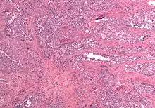 There is debate over the naming of MMMT; the term carcinosarcoma was formerly used to describe lesions with homologous tumors, and "malignant mixed Müllerian tumor" or "mixed mesodermal tumor" was used to describe heterologous tumors. While "carcinosarcoma" now considered standard, "malignant mixed Müllerian tumor" has a lengthy history within gynecological literature and is expected to continue to be used. The naming issue to a certain extent reflects histological characteristics and development of the tumors, in which the different types of tissues are believed to either develop separately and join into a single mass (the "collision" theory), that an adenocarcinoma stimulates the stroma to create a tumor (the "composition" theory), or that the tumor is the result of a stem cell that differentiates into different cell types (the "combination" theory).[1] "Collision" tumors are normally easily recognized and not considered true MMMTs; the "combination" theory is most widely held, and is due to evidence that the tumors develop from a single line of cells, developing in a fashion similar to the fundus of the uterus from the Müllerian duct – first from a stem cell into a population of cells, that then differentiates into epithelial and stromal components.[1][2]