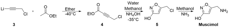 McCarry's synthesis is a three step synthesis involving a lithium acetylide produced from propargyl chloride. The acetylide (3), was dissolved in ether, cooled to -40 °C, and treated with excess ethyl chloroformate to afford ethyl 4-chlorotetrolate (4) in a 70% yield. (4) was then added to a solution of water, methanol and hydroxylamine at -35 °C. At a pH of between 8.5 and 9, the isoxazole (5) was recovered in a 41% yield. Muscimol was formed in a 65% yield when (5) was dissolved in a saturated solution of methanol and anhydrous ammonia and heated from 0 °C to 50 °C. The total yield was 18.7%.[33]