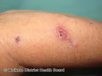 The type strain of M. abscessus, most commonly referred to as ATCC19977, was isolated in 1953 from a human knee infection presenting with abscess-like lesions, leading to the strain being named "abscessus".[10] The strain wasn't recognised as a distinct species until 1992, however, when DNA hybridisation work identified it as genetically distinct from its relative, M. chelonae.[11] The genome of the type train was published in 2009.[12]