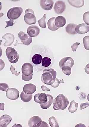 | Blood smear from a person with myelodysplastic syndrome. A hypogranular neutrophil with a pseudo-Pelger-Huet nucleus is shown. There are also abnormally shaped red blood cells, in part related to removal of the spleen. | |
