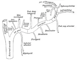 ![]() Plan of branches of internal maxillary artery. (Inferior alveolar labeled at bottom center.) | |
