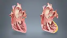 Myocardial rupture is most common three to seven days after myocardial infarction, commonly of small degree, but may occur one day to three weeks later. In the modern era of early revascularization and intensive pharmacotherapy as treatment for MI, the incidence of myocardial rupture is about 1% of all MIs.[6] This may occur in the free walls of the ventricles, the septum between them, the papillary muscles, or less commonly the atria. Rupture occurs because of increased pressure against the weakened walls of the heart chambers due to heart muscle that cannot pump blood out effectively. The weakness may also lead to ventricular aneurysm, a localized dilation or ballooning of the heart chamber.