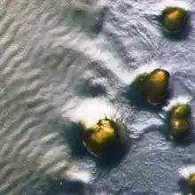 M. xanthus appear as gram-negative rods without flagella.[4] These rods have an average length of 7 microns and width of 0.5 microns.[5] It utilizes type IV pilus (T4P) to move in a "gliding" manner, crawling along a surface.[6] As a colony or swarm, M. xanthus appear as a thin layer of ripples, often moving toward prey. In its spore form, the bacterium become a sphere with a thick outer membrane. This spore is yellow-orange, giving M. xanthus its name (xanthós, Ancient Greek meaning "golden"). [4]