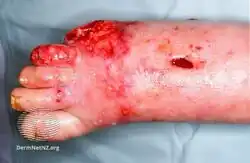 | Risk factors | Poor immune function such as from diabetes or cancer, obesity, alcoholism, intravenous drug use, peripheral artery disease[2][3] |