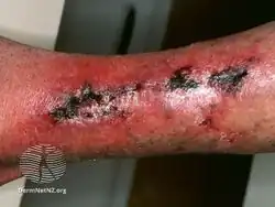 - 1 2 3 Trent, Jennifer T.; Kirsner, Robert S. (2002). "Necrotizing fasciitis". Wounds. 14 (8): 284–92. Archived from the original on 2018-08-16. Retrieved 2018-03-17.